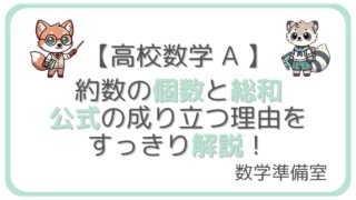 場合の数 【数学A】場合の数03:約数の個数と総和 約数の個数や総和は、素因数分解を使うと計算が簡単です。この記事では、具体例を交えながら素因数分解の指数に1を足して掛ける公式と、約数の総和を算出する公式をわかりやすく解説しています。数学初心者にも理解しやすく、効率的な計算方法を学べます。 場合の数