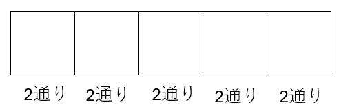 5つの場所は、それぞれ「〇」か「×」の2通りの並べ方あるので、総数は次のように計算することができます。