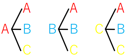 (3) A, B, C の3文字から、同じ文字を繰り返してもよいとき、2文字を並べる。