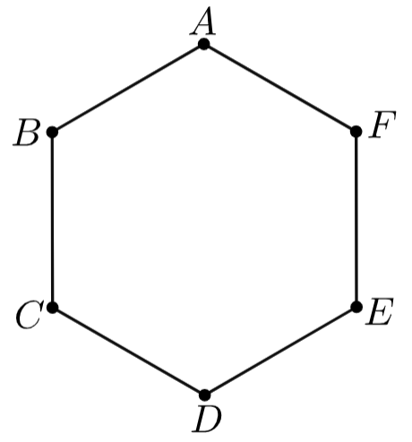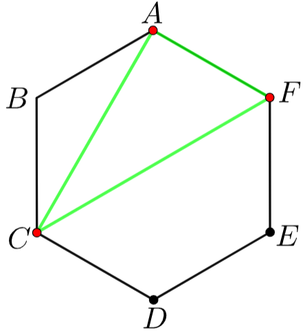 例えば、6個の頂点からAとCとFを選ぶと次のような三角形が1つ定まります。