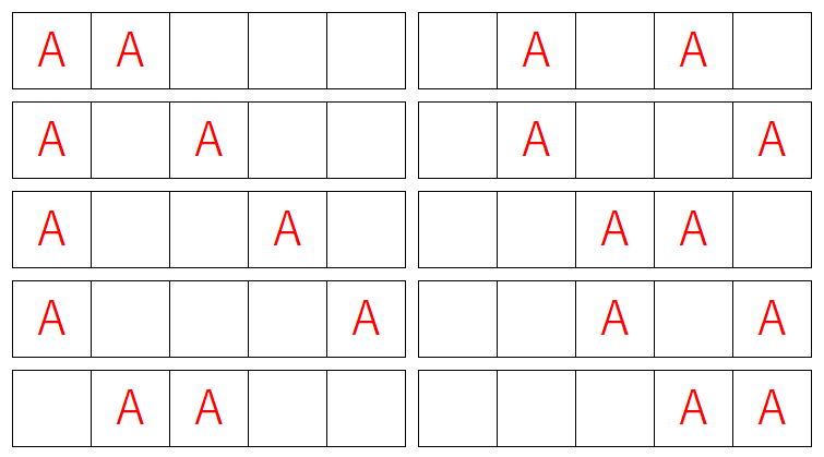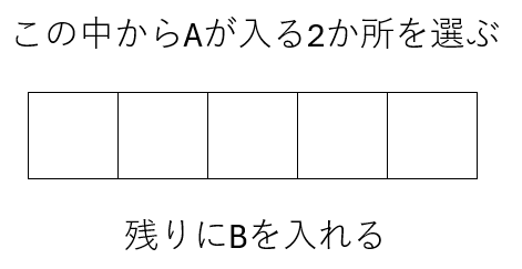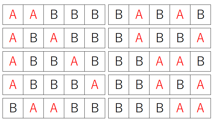 5つの位置の中から、A を置く2か所を選び、残りの位置に B を入れることで、すべての並び方が決まります。