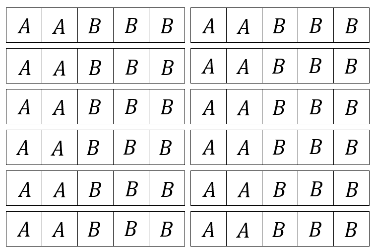 「A」2個と「B」3個の並び方は何通りあるか。