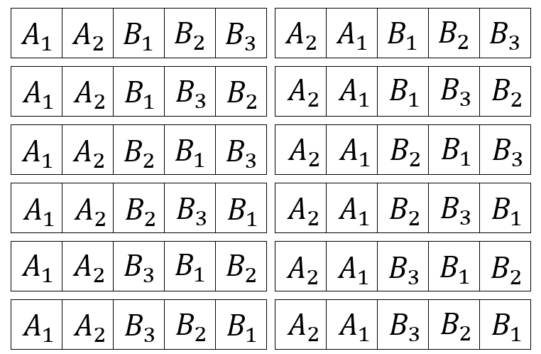 たとえば、すべてを区別して \(A_1, A_2, B_1, B_2, B_3\) 並べた中には、次のような12通りの並べ方が存在します。