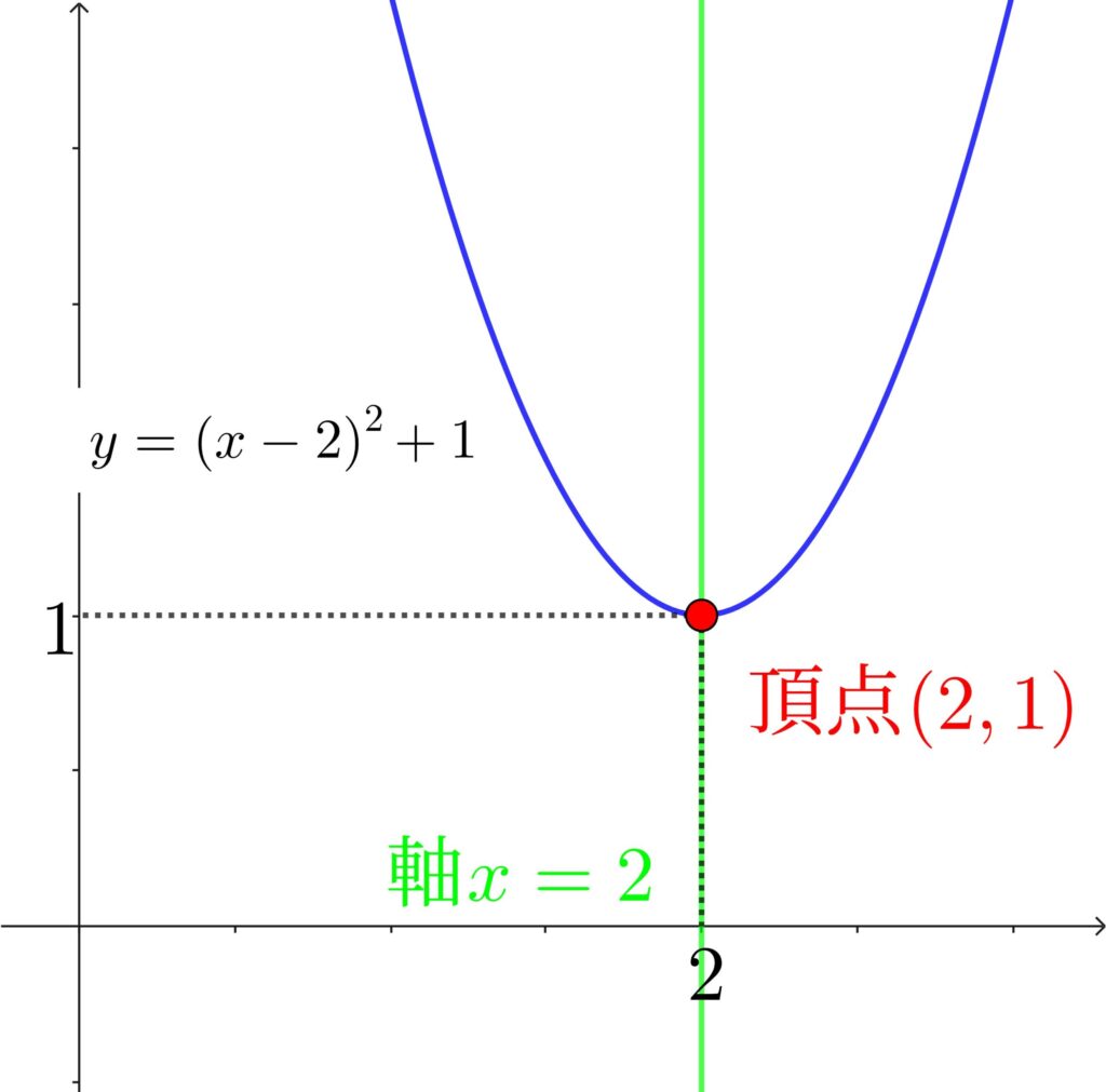 よって、頂点は \((3,1)\) となり、軸は放物線の真ん中の線のことで、頂点を通りますから \(x=3\) となります。