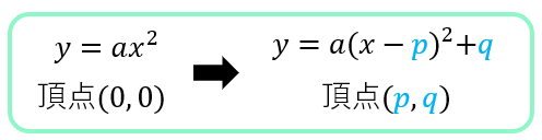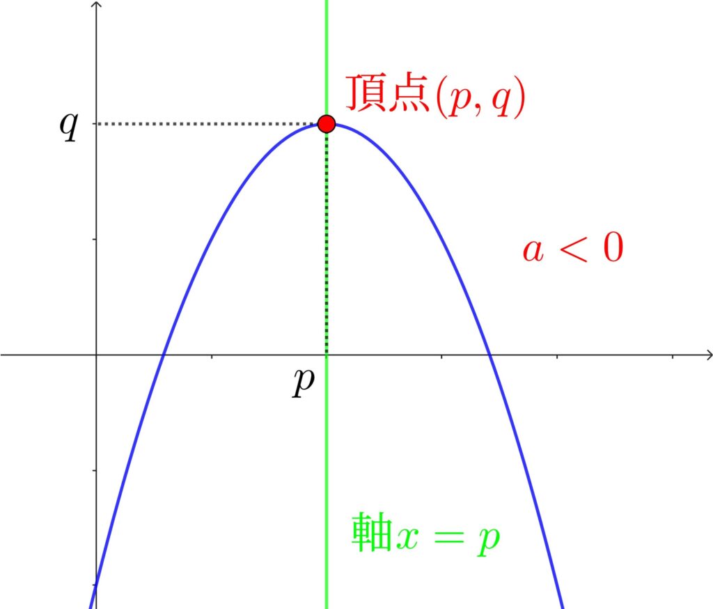 \(y=a{(x-q)}^2+q\) の形から、頂点 \((p,q)\)と軸 \(x=p\) がすぐ分かるようになりたいな!