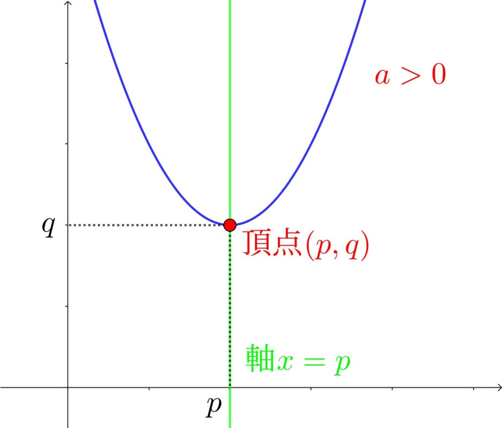 2次関数\(y=a{(x-p)}^2+q\) のグラフは、\(a>0\) のとき下に凸、\(a<0\) のとき上に凸の放物線になる。
