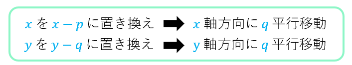 \(\color{blue}{x→(x-p),\:y→(y-q)}\) という置換を行うと \(x\) 軸方向に \(p\)、\(y\) 軸方向に \(q\) 平行移動することができます。