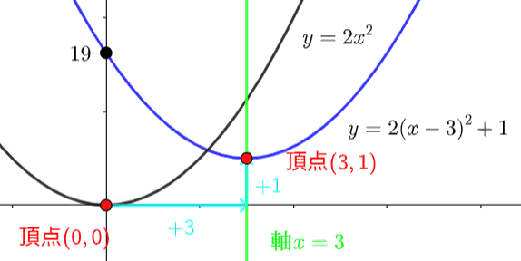 \(y=2(x-3)^2+1\)は、\(y=2x^2\) のグラフを、\(x\) 軸方向に \(3\)、\(y\) 軸方向に \(1\) だけ平行移動したグラフです。