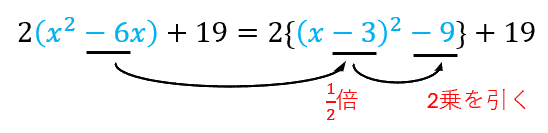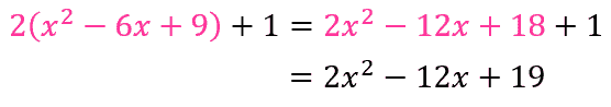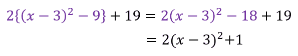例として、\(2x^2-12x+19\) を平方完成すると \(2(x-3)^2+1\) になります。