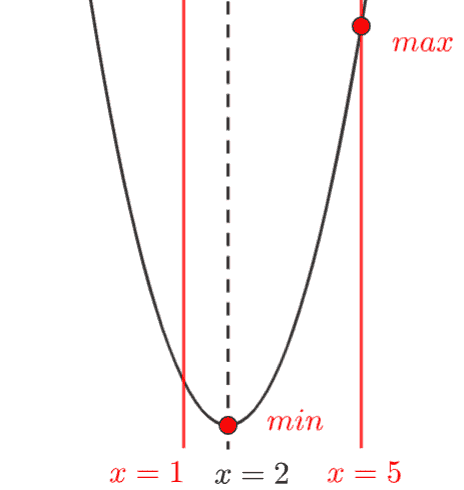 グラフを見ると、軸(\(x=2\))からより遠い \(x=5\) のときが最大値になることが一目でわかりますね!
